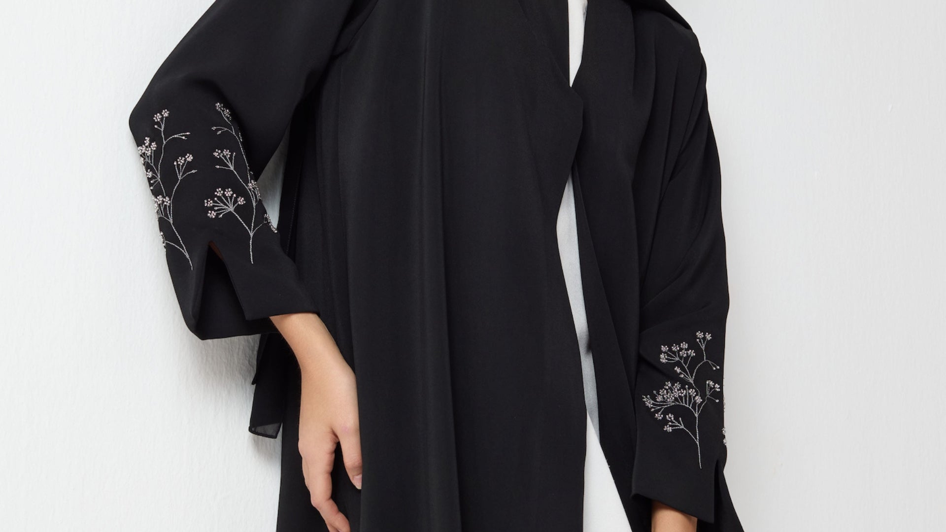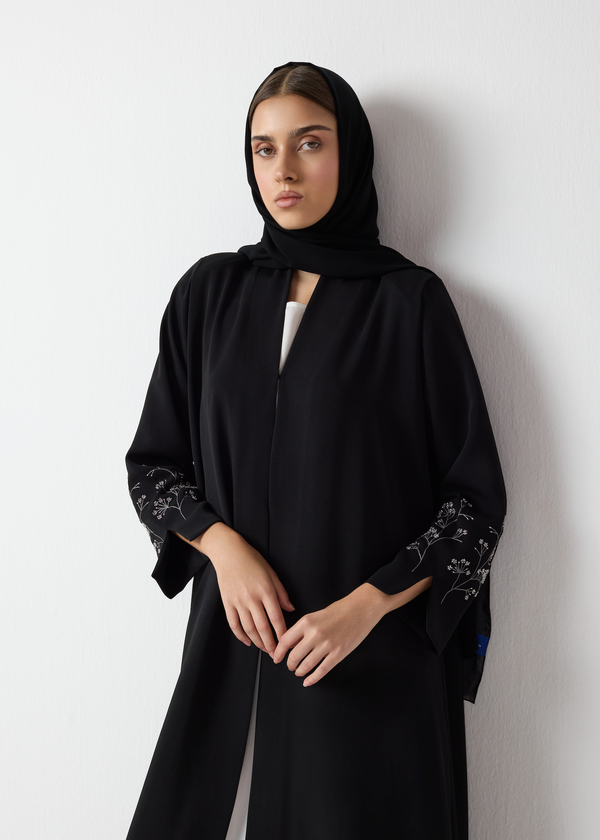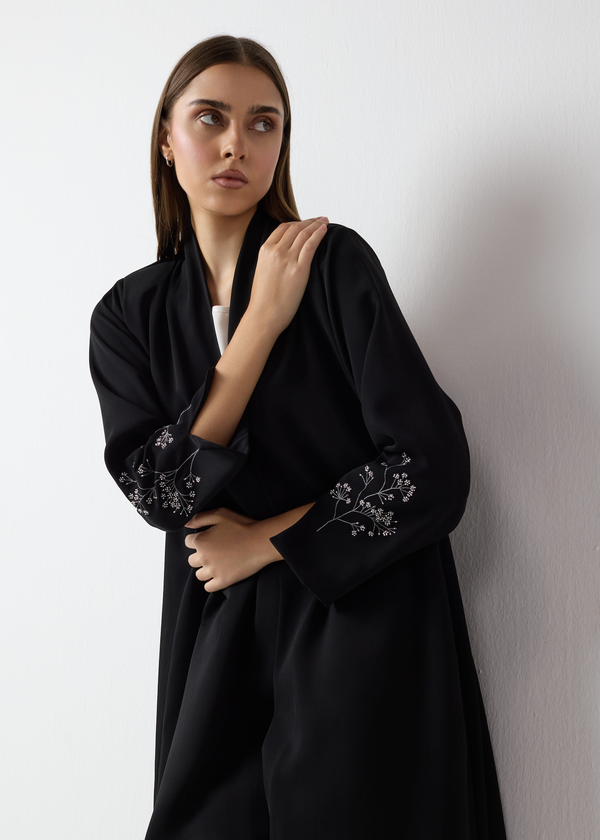 We translate the spirit of Sadim (nebula) into thread: star-like accents, celestial arcs, luminous gradients, and botanical constellations applied to black abayas, open abayas, kimono and farasha silhouettes, evening gowns, and kaftans. Keywords we satisfy naturally: embroidered abaya uae, hand embroidered abaya dubai, evening abaya with embroidery, modest evening wear uae, eid abaya, wedding abaya.
