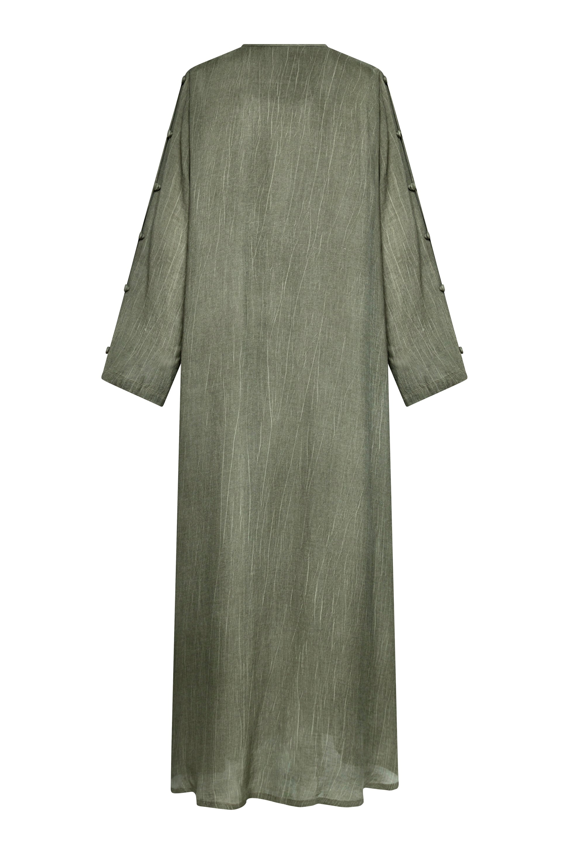 A muted Dark Grey textured abaya with a relaxed flowing silhouette, featuring soft gathered neckline and delicate button detailing along the front and sleeves for a refined minimal elegance.