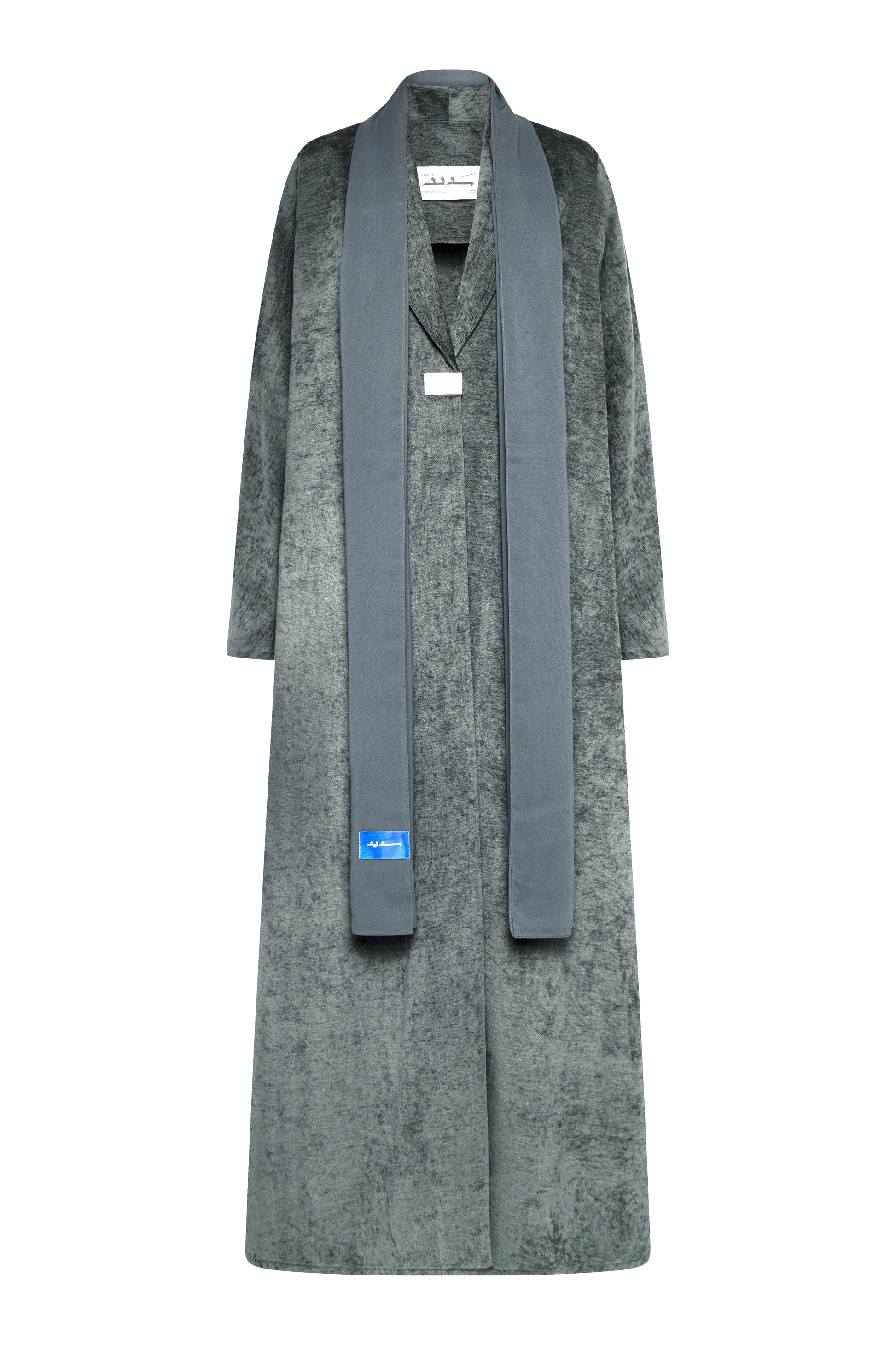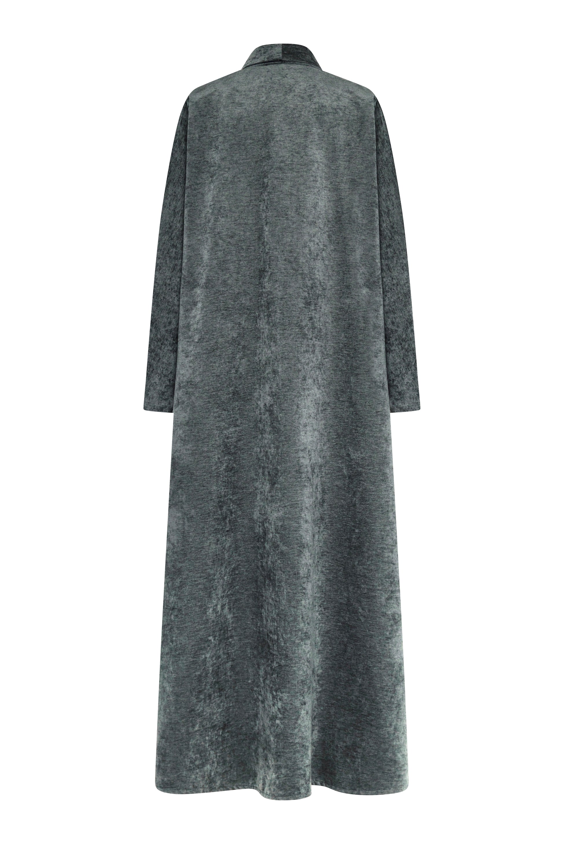 A rich charcoal-Blue velvet abaya with a graceful flowing cut, refined shawl collar panel, and a sleek metallic clasp detail that adds a subtle statement to its minimalist silhouette.